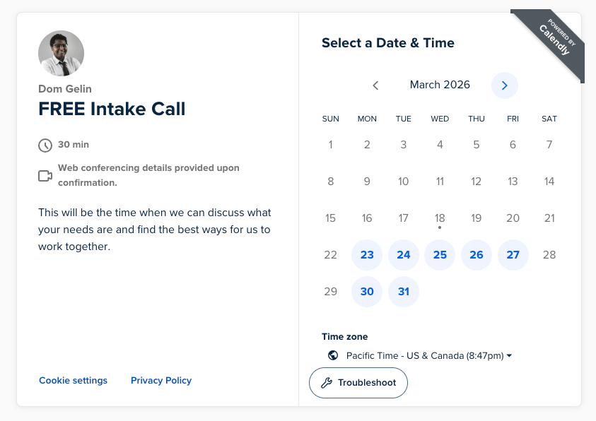 Below is my calendar. Go ahead and find a time that works for you. We can discuss what your needs are and find the best ways for us to work together.
